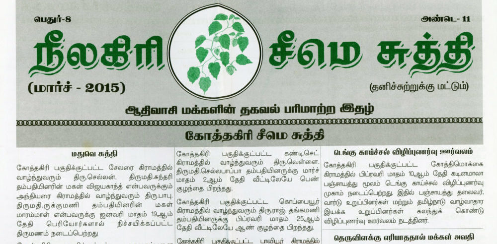 Seemai (cultural boundary) Suddhi (news) is a multilingual newspaper from a community of indigenous barefoot journalists and storytellers. For the first nine years, this newspaper was monthly but became quarterly in recent years due to funding constraints. At present, barefoot reporters from multiple communities meet every month to make journalistic and editorial decisions on the information that can be shared in the biosphere reserve. The newspaper emerged from the need to circulate knowledge amongst local communities in languages and mediums that are accessible to them. News that gets featured ranges from births, deaths and culturally significant ceremonies in the communities to relevant information on agriculture, livelihoods, sacred geographies and ecologies and information about social security and civic issues.